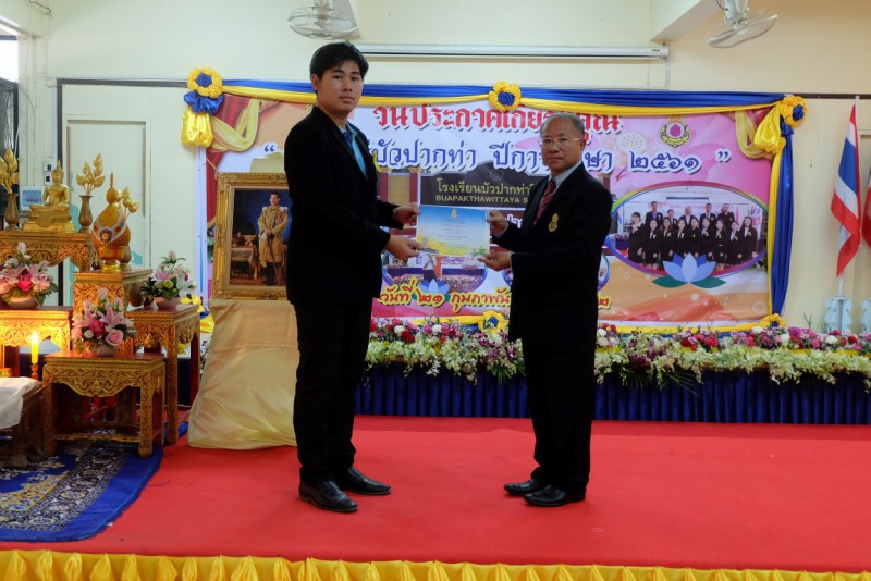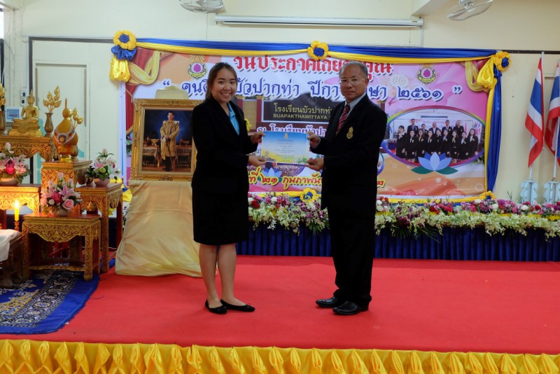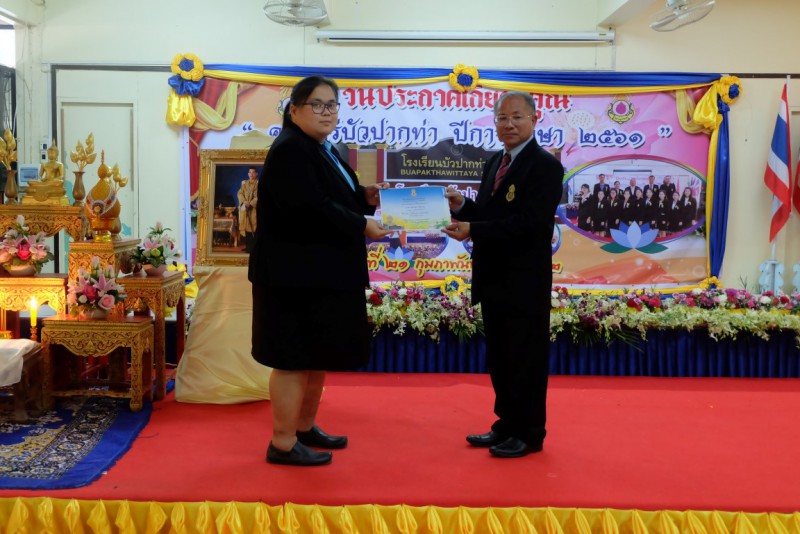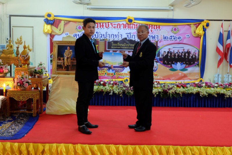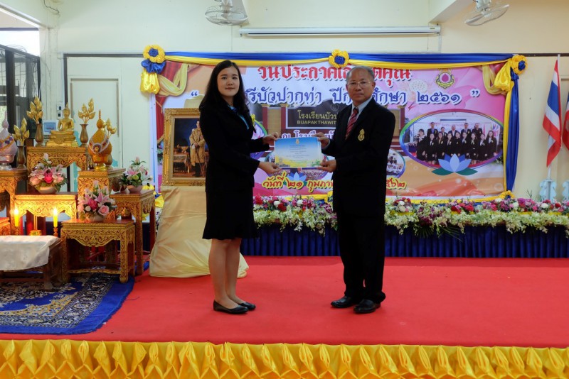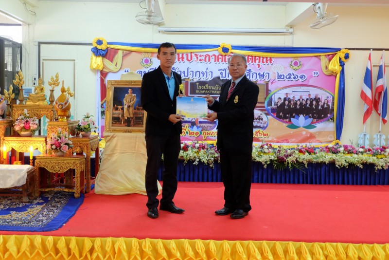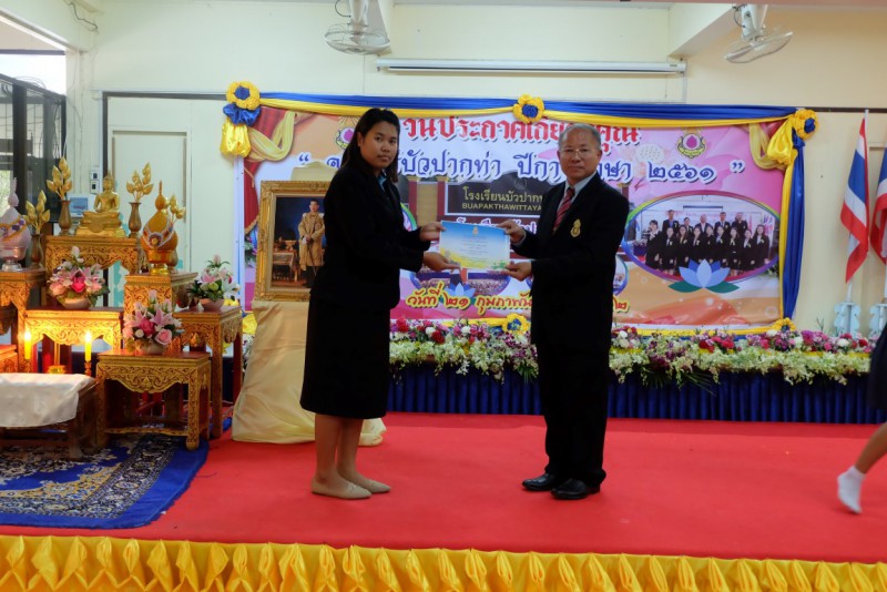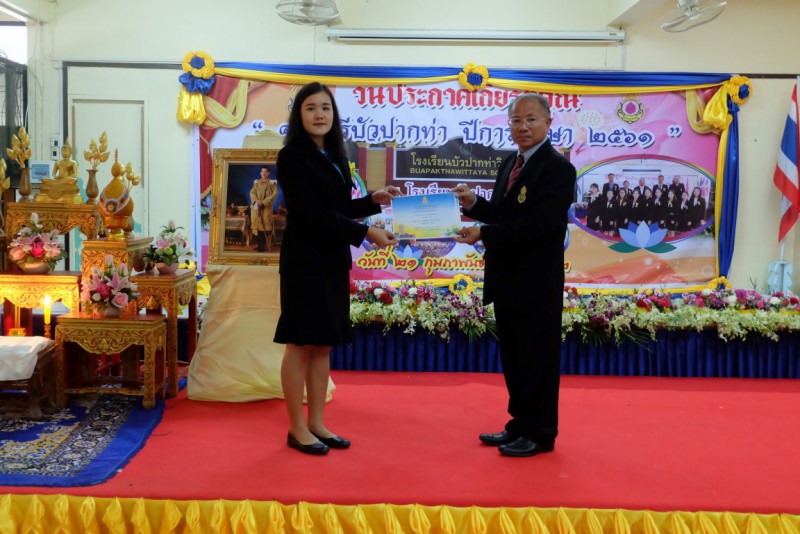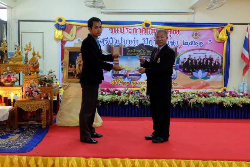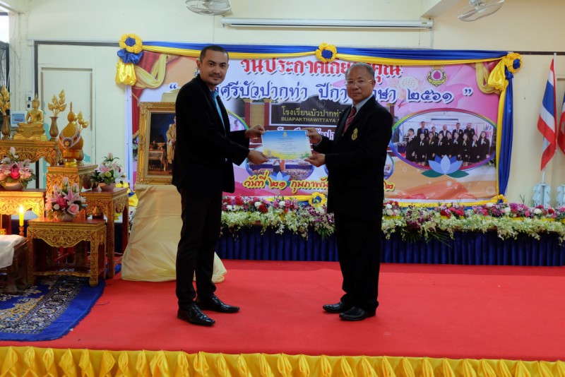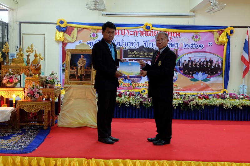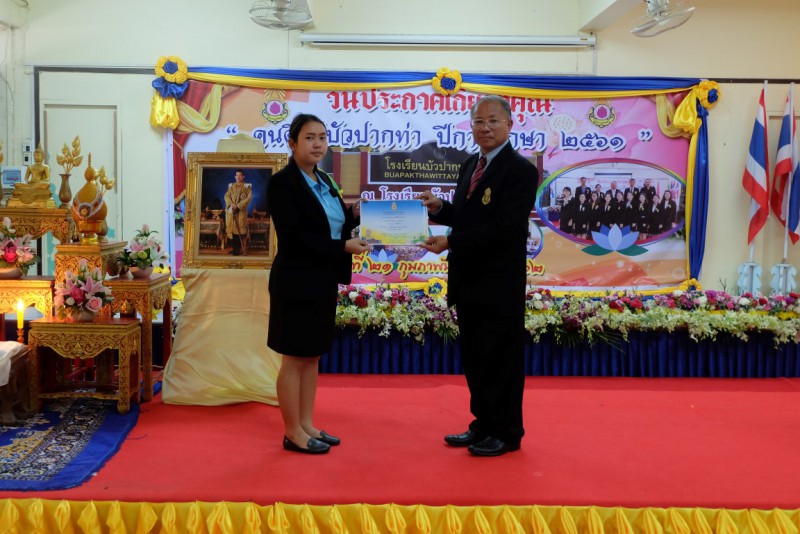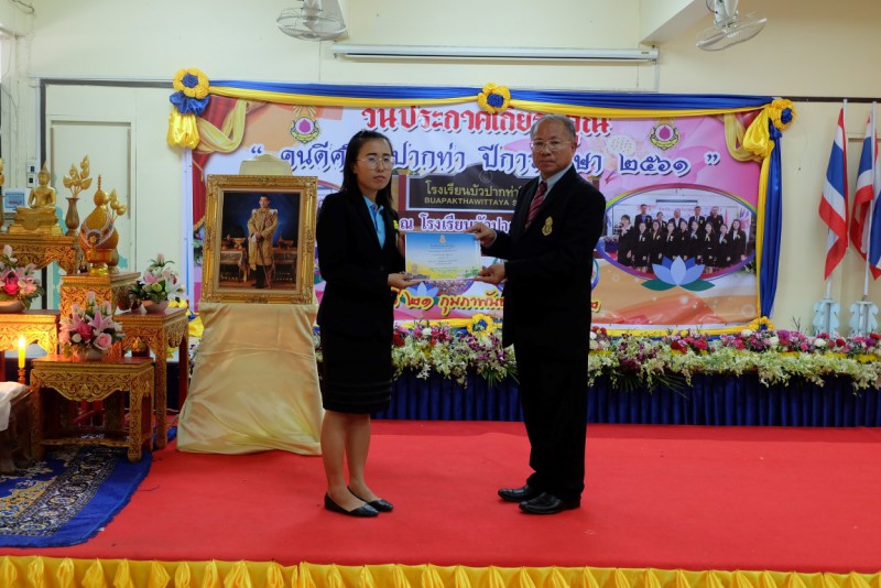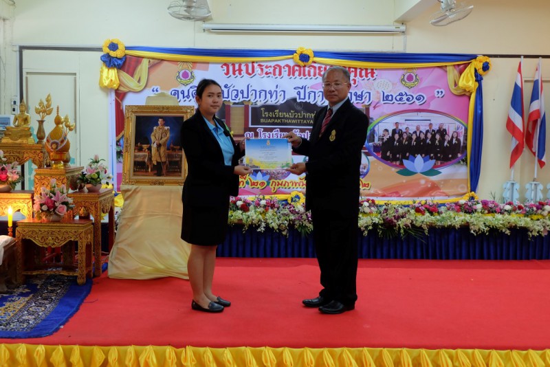 วันที่ 21 กุมภาพันธ์ 2562 เวลา 13.00-15.00 น. โรงเรียนบัวปากท่าวิทยา นำโดยผู้อำนวยการประเจิด อยู่สงค์ คณะครูและนักเรียน ร่วมกิจกรรมวันประกาศเกียรติคุณ "คนดีศรีบัวปากท่า ปีการศึกษา 2561" โดยมีครูและนักเรียนของโรงเรียนบัวปากท่าวิทยา จำนวน 50 คนที่ได้รับการพิจารณาคัดเลือกให้เข้ารับรางวัลคนดีศรีบัวปากท่า ซึ่งแบ่งออกเป็นครูผู้รักษาวินัยดีเด่น จำนวน 4 ราย ครูผู้ปฏิบัติการสอนดีเด่น จำนวน 5 ราย ครูที่ปรึกษาดีเด่น จำนวน 8 ราย ครูที่ปฏิบัติการดูแลช่วยเหลือนักเรียนดีเด่น จำนวน 19 ราย ครูที่มีคุณธรรม จริยธรรมดีเด่น จำนวน 16 ราย ครูผู้สร้างนวัตกรรมการเรียนการสอนดีเด่น จำนวน 2 ราย นักเรียนที่มีผลการเรียนดีเด่น จำนวน 2 ราย นักเรียนที่สร้างชื่อเสียงให้กับโรงเรียน จำนวน 19 ราย นักเรียนที่มีคุณธรรม จริยธรรมดีเด่น จำนวน 13 ราย นักเรียนผู้บำเพ็ญประโยชน์ดีเด่น จำนวน 14 ราย นักเรียนผู้นำดีเด่น จำนวน 7 ราย รวมถึงรางวัลประเภทห้องเรียนดีเด่น ประเภทกลุ่มสาระการเรียนรู้ดีเด่น ประเภทชุมชนที่สนับสนุนการศึกษาดีเด่น และประเภทคณะกรรมการสถานศึกษาดีเด่น เพื่อส่งเสริมให้ครูและนักเรียนปฏิบัติตนเป็นแบบอย่างที่ดีให้กับบุคคลอื่น และประกาศเกียรติคุณ ครูและนักเรียนที่ทำคุณงามความดีให้เป็นแบบอย่างที่ดีแก่ชุมชนและสังคม |